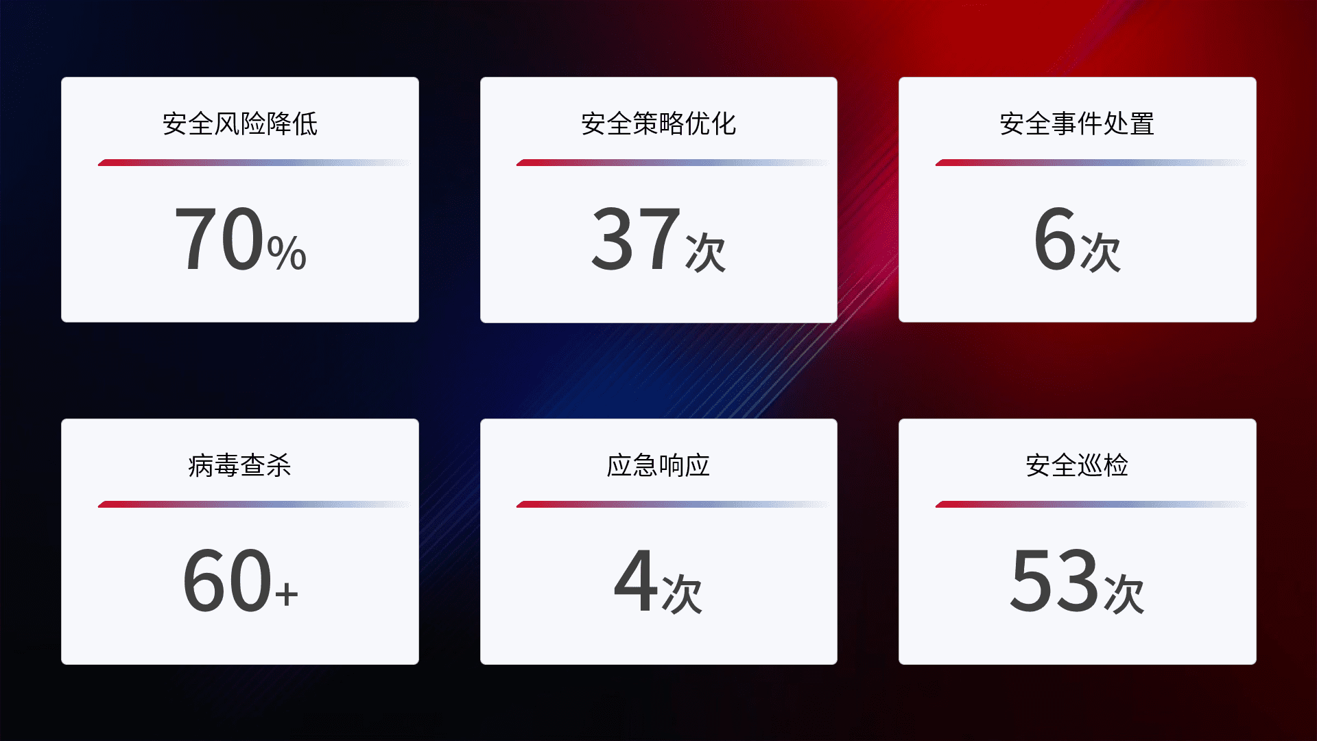 提供全面的安全事件报告体系,,,包括处置报告、、、周报、、、、季度和年度总结,,,结合持续监控,,,帮助客户深入了解网络安全状况。。。。