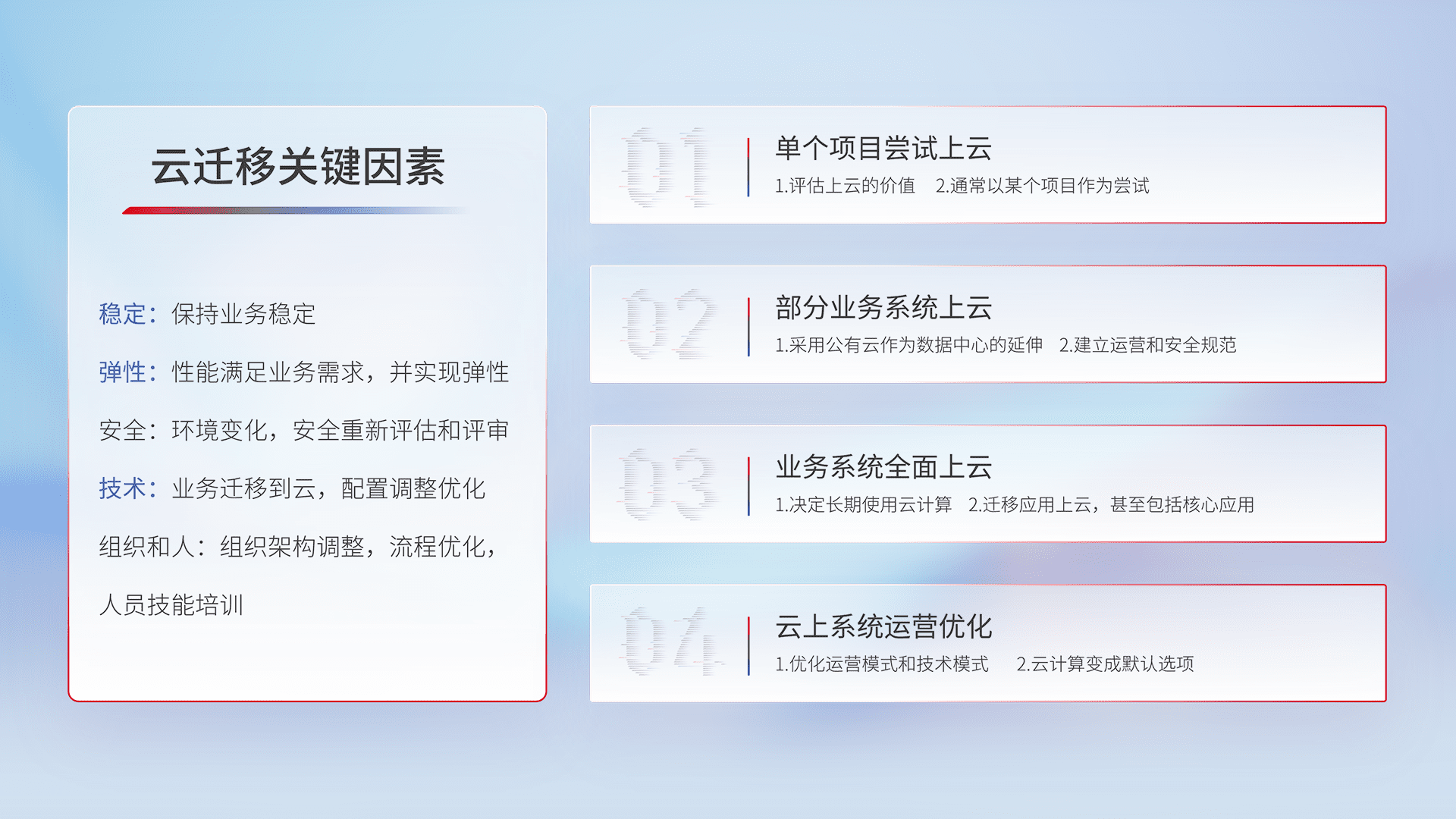 结合实际业务,,,从规划设计、、、、云平台选型、、、云原生改造、、、、数据迁移、、集成交付,,,,迁移全过程为客户识别最佳上云路径,,,,做好风险识别管理,,,,设计网络架构、、身份权限、、、、安全审计合规、、、操作审计、、、日志审计、、、监控告警策略、、多站点容灾设计等,,,对云上基础设施进行整体规划,,,,提升IT治理水平,,,,以满足弹性、、高可用、、高性能的需求。。。。