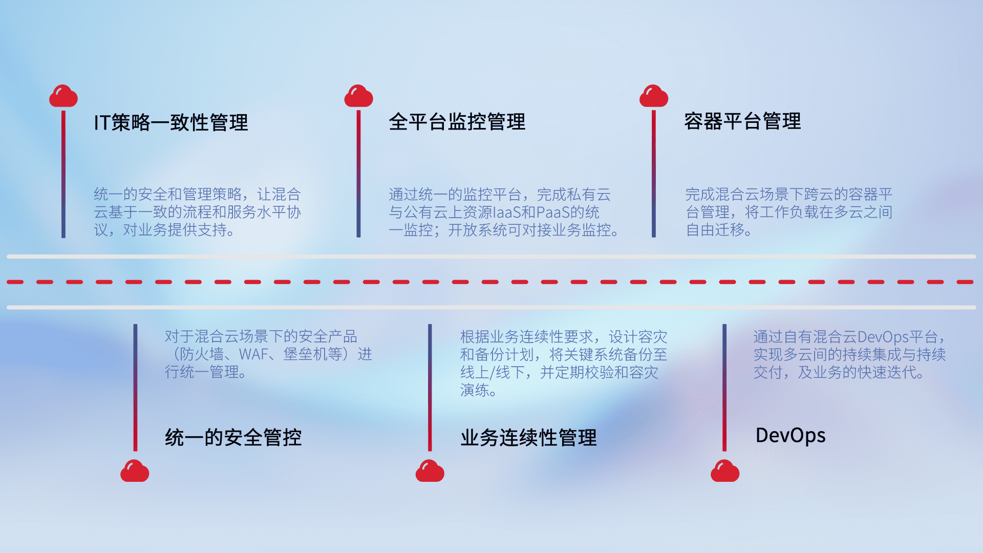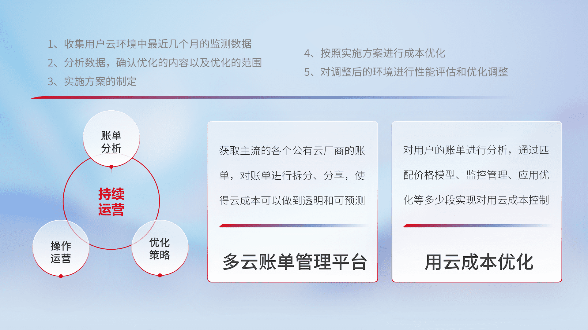 通过多云纳管,,,,以统一的资源数据模型把客户的云资源进行抽象和封装,,,,进而实现对多云资源的统一操作,,,,保障云资源管理的可靠性、、稳定性与可用性。。量身定制化运维内容,,,配置、、、、开发运维、、补丁管理、、备份、、、、监控、、认证和访问管理、、、审计和日常巡检等,,,,保障在用云过程中的可靠度,,,稳定度以及高可用率。。。